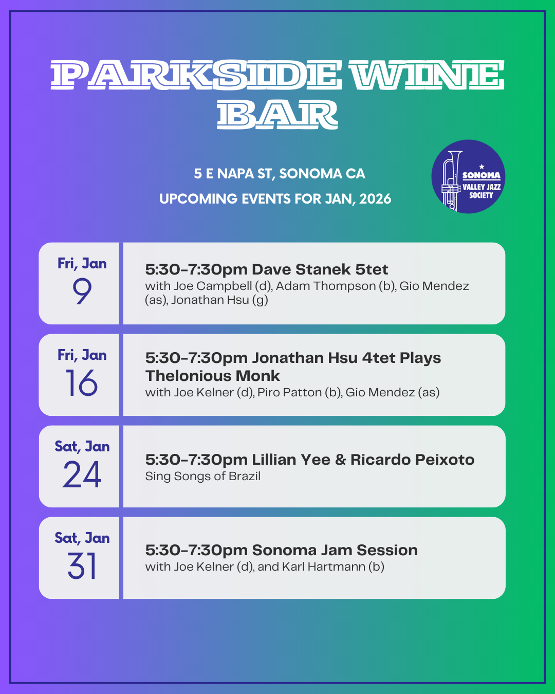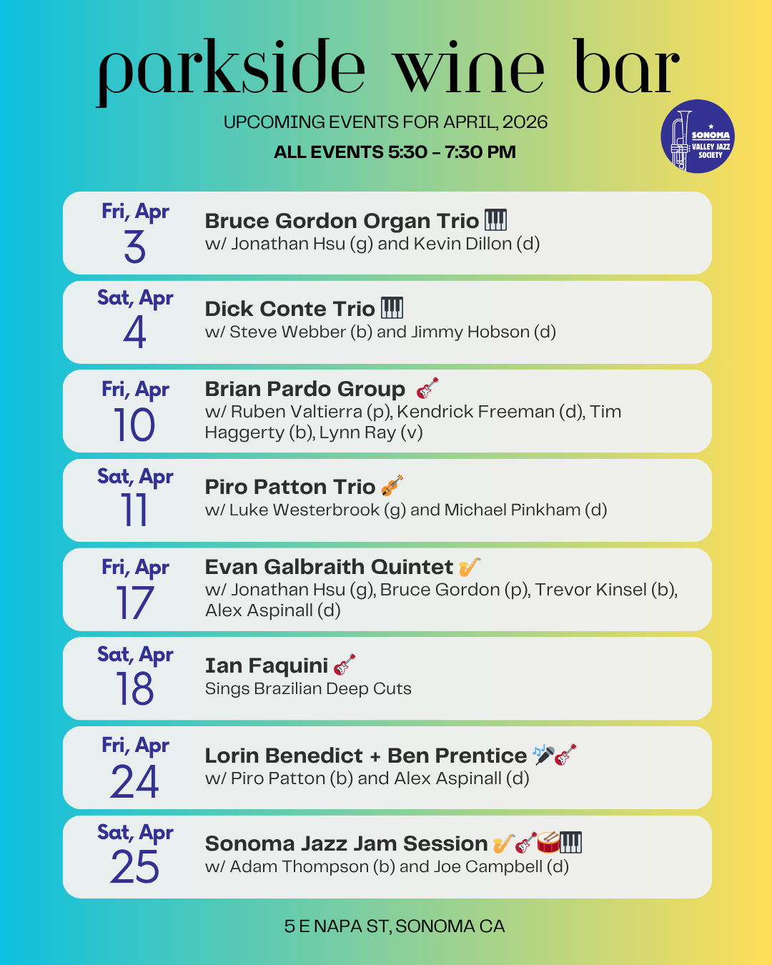 Great Wine, Food and Jazz!Parkside Wine Bar 5 E. Napa Street, Sonomano one under 21 years old is allowed Sign up with your email address to receive news and updates. Email Address Sign Up Thank you!